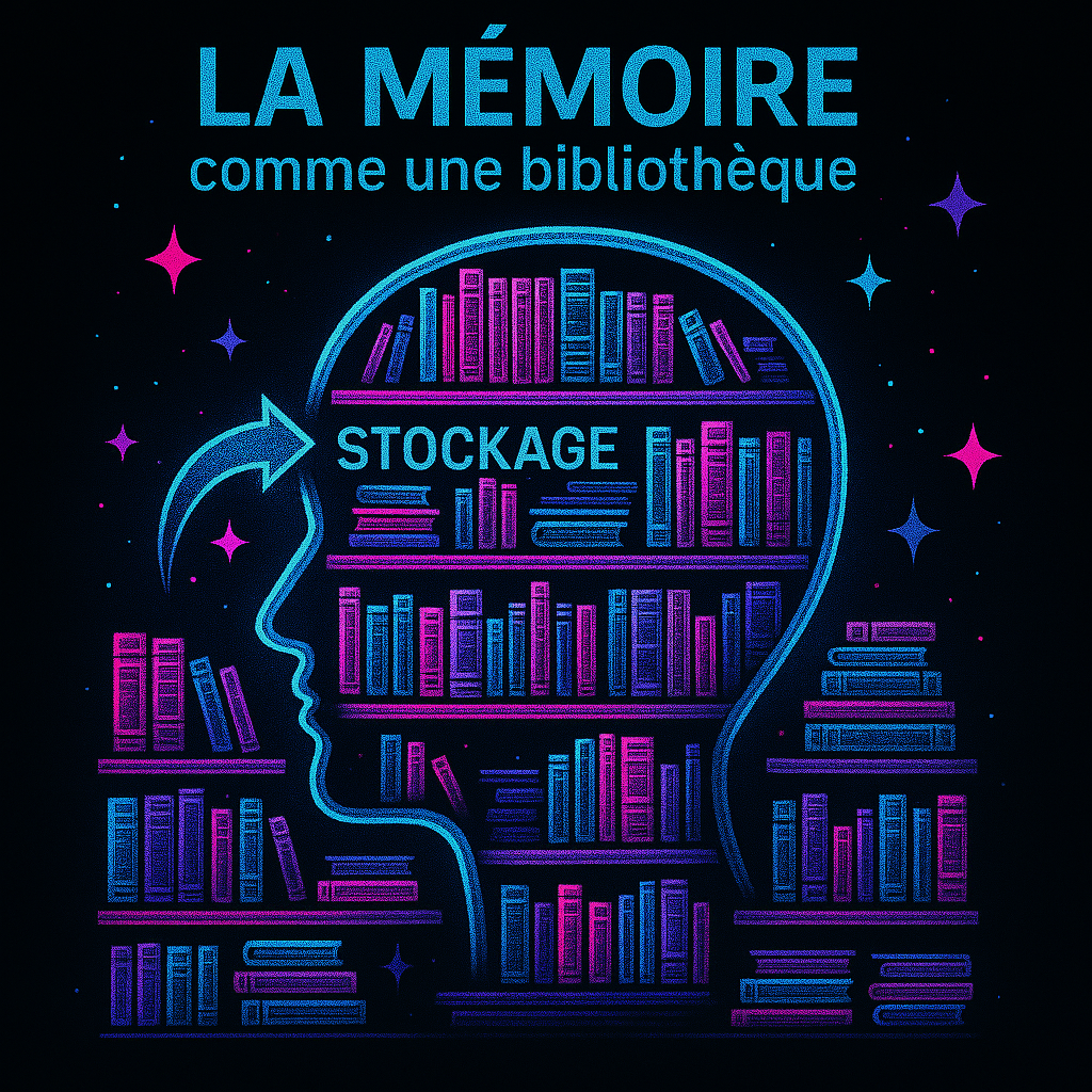 Imagine la mémoire à long terme comme une grande bibliothèque avec des rayonnages et des compartiments. Chaque livre représente une information ou un souvenir stocké dans ta mémoire. Les informations sont rangées dans des compartiments spécifiques en fonction de leur nature et de leur importance. Tout comme il est possible de revenir plus tard dans une bibliothèque pour récupérer un livre dans un rayonnage précis, tu es capable de récupérer des informations stockées dans ta mémoire à long terme en accédant aux compartiments pertinents. Cependant, tout comme dans une bibliothèque, il est possible que les informations soient mal rangées ou difficiles à trouver si elles n’ont pas été correctement encodées et stockées.