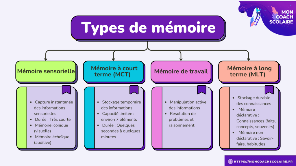 La mémoire à long terme : C’est celle qui stocke des informations pour une période de temps plus longue, de plusieurs heures à plusieurs années. Elle est essentielle pour apprendre des concepts plus complexes et pour retenir des informations pour les examens.