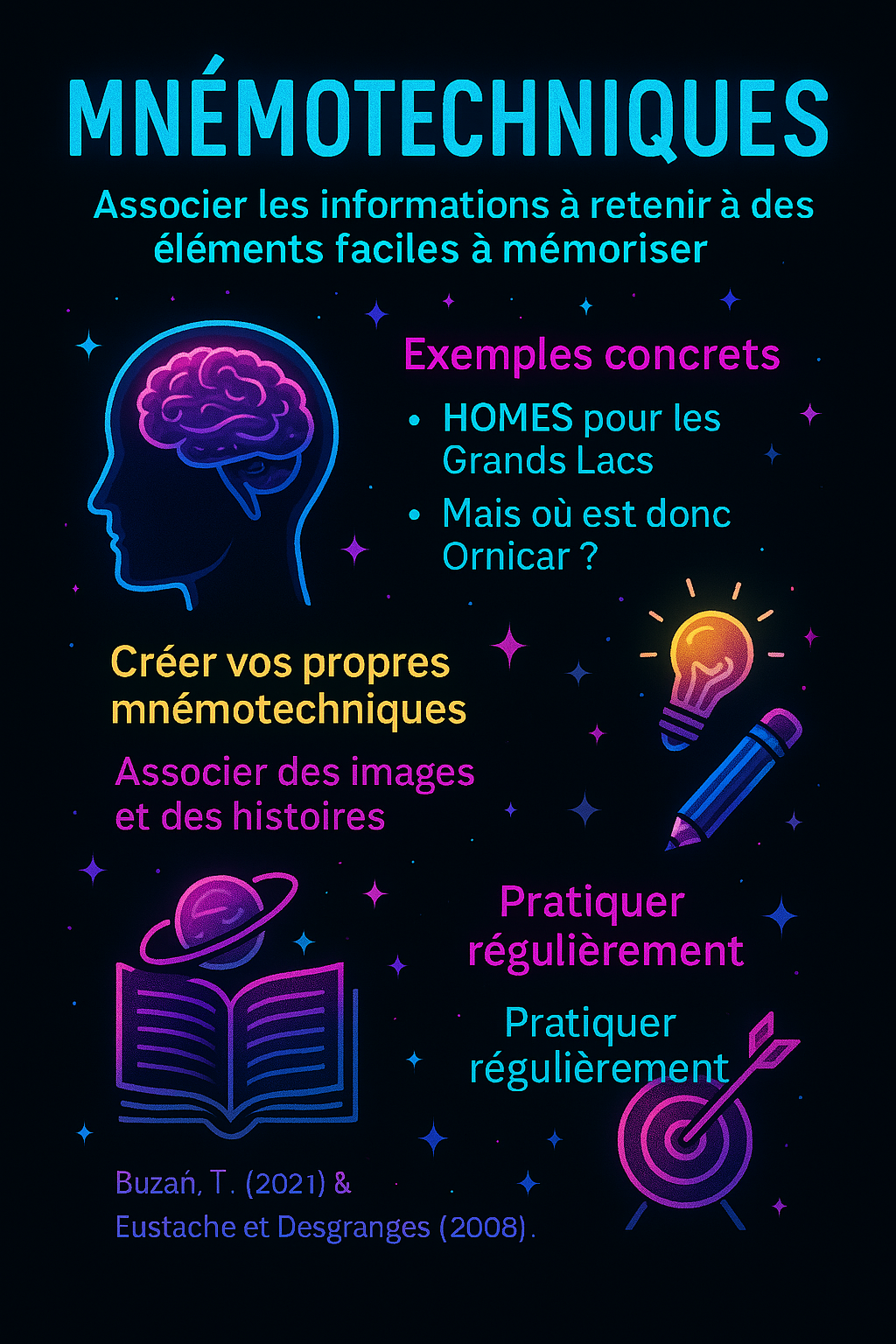 Les mnémotechniques sont des méthodes simples et amusantes pour mieux mémoriser des informations difficiles, comme des listes, des formules ou des concepts abstraits.